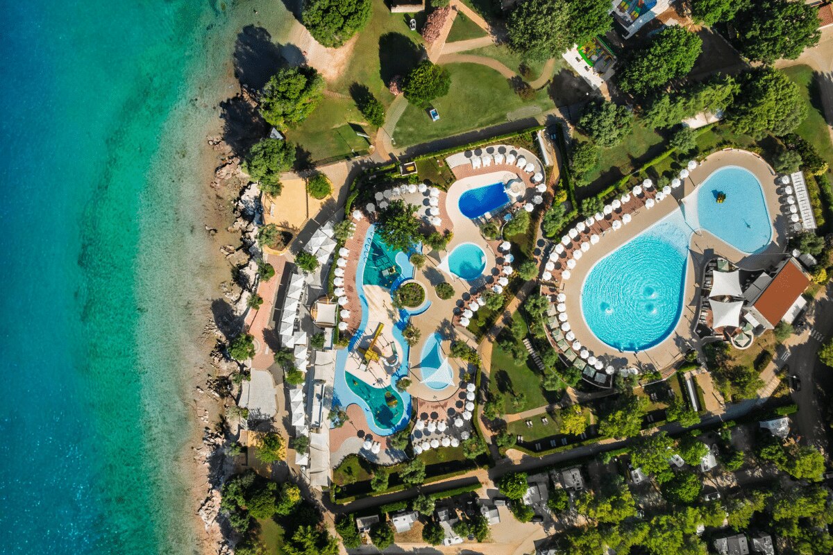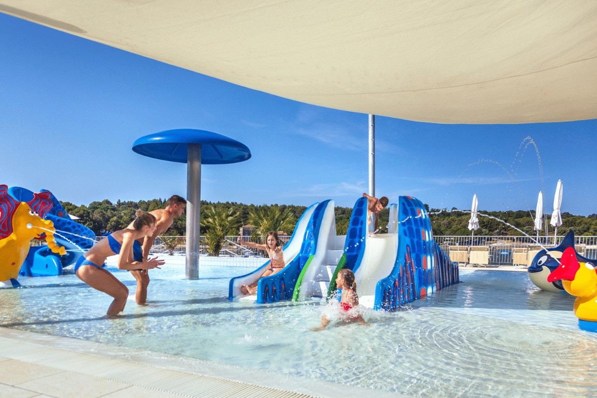 Jeden z najbardziej rozbudowanych kempingów rodzinnych w Chorwacji. Ogromny aquapark o powierzchni 6500 m² z brodzikiem, statkami pirackimi i fontannami to absolutny hit dla dzieci w wieku 3–6 lat.