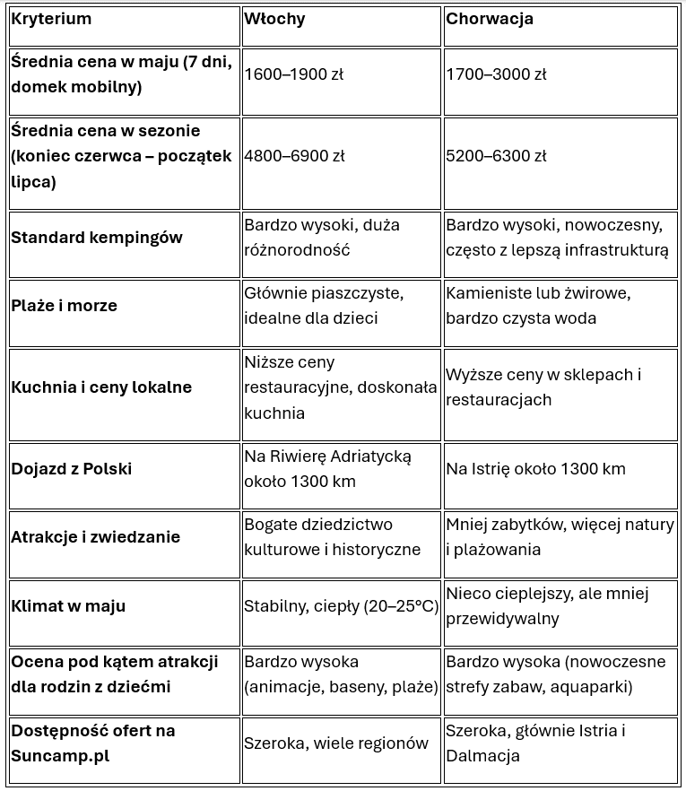 Porównanie: Włochy vs Chorwacja (na podstawie danych Suncamp.pl)