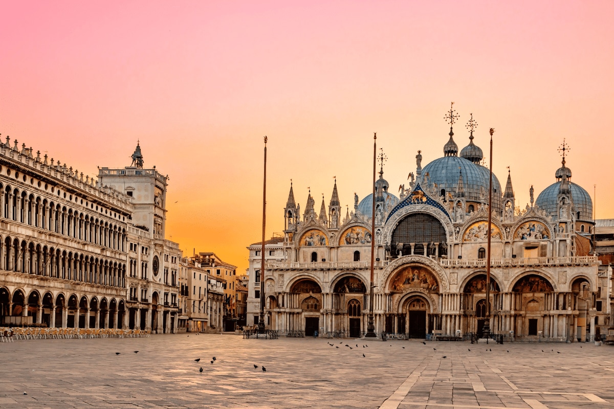 - Bazylika św. Marka – imponująca świątynia z bizantyjskimi mozaikami. Ciekawostka: w środku znajduje się Złoty Ołtarz (Pala d’Oro) wysadzany tysiącami drogocennych kamieni.